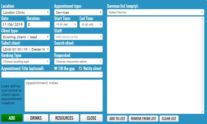 If a lead is selected, the system will display the message “Lead will be converted to client upon appointment creation.”