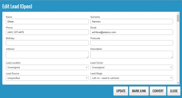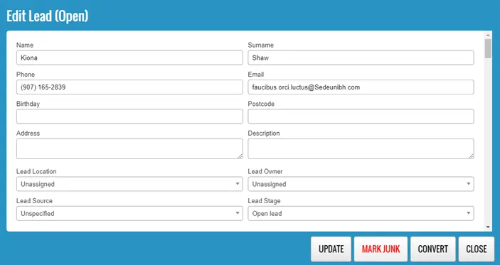 To mark a lead as a junk lead, open the lead from the leads table and click on the “MARK JUNK” button.
