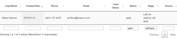 You can also filter the lead entries by using the text boxes under each column, this will allow you to perform a more granular search e.g. open leads with the stage “need to call back”